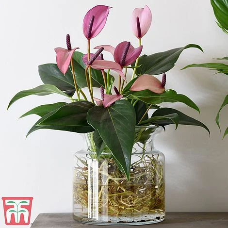 Simple and stylish, this elegant Anthurium comes in a clear glass vase, allowing you to admire its twining network of roots. This eyecatching soiless display makes a fascinating focal point that captures the latest trend for hydroponic house plants. This bareroot Anthurium is easy to grow – simply unpack the plant when it arrives and just add water! With its glossy evergreen foliage and showy flowers, this beautiful perennial makes a sophisticated gift that will last far longer than a bouquet of cut flowers. Height and spread: 45cm (18″).