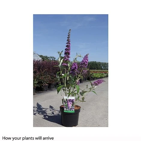 This compact dwarf butterfly bush is a fraction of the size of traditional varieties – perfect for growing in smaller borders and patio containers. With a bushy, well branched habit, Buddleja davidii ‘Peacock’ is as showy as its namesake bearing masses of mauve flowers from July to September. The scented blooms are constantly busy with butterflies and other pollinating insects, making a fabulous eye-catching garden feature. Height and spread: 120cm (48″).