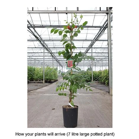 The Trumpet Vine is a large and vigorous woody climber, producing a dense cover of light green foliage, ideal for training up walls, fences and pergolas. Large, trumpet-shaped flowers explode from deep red buds that usually last until the first frosts. Campsis radicans ‘Stromboli’ is a valuable addition to your garden for not only a superb performance of flowers, but this shrub is particularly attractive to wildlife. Height & Spread: 7m (23′).