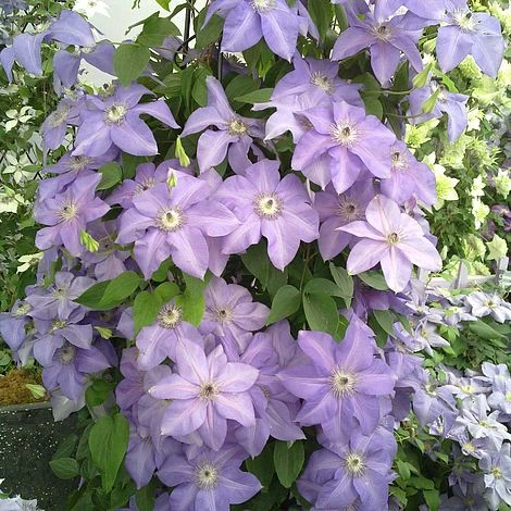 The large mauve flowers of Clematis ‘Shimmer’ are borne in profusion throughout the summer. Flowers begin from a height of around 60cm (2’) and continue all the way up the stem to create a fabulous display. This beauty has a vigorous but reasonably compact habit making it easily manageable whether you grow it in a container, against a trellis or trained through roses on an archway. Height: 180cm (70″). Spread: 100cm (39″). Pruning group 3.