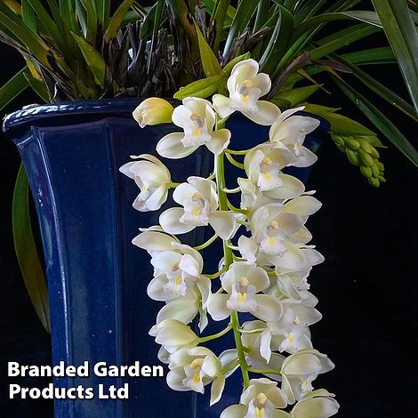 Add some magic to your interior décor with this glamorous cymbidium orchid. Cymbidium ‘Ice Cascade’ is a spectacular houseplant for a hanging pot. Pendant racemes of long-lasting fragrant white flowers cascade from a crown of spiky, evergreen leaves. Well deserving of its RHS Award of Garden Merit, Cymbidium ‘Ice Cascade’ blooms for many weeks, delivering a spectacular show in a bright room or conservatory and making a charming gift for that special someone. Delivered with 5-7 flower bracts. Height and spread: 60cm (24in).