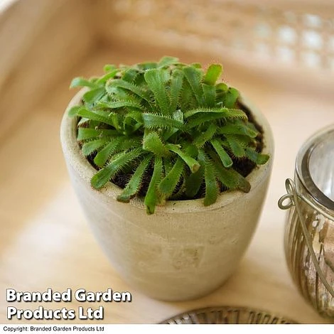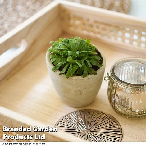 Drosera aliciae is an unusual carnivorous houseplant forming adorable rosettes of spoon-shaped leaves. The leaves are covered in striking bright red hairs, each bearing a droplet of sticky liquid at the tip, which gives the plant a sparkly appearance and traps insects such as midges and flies as well as pests such as gnats and whitefly that may be troubling your other houseplants. Very easy to grow, this gorgeous Princess Alice’s sundew is a simple and highly decorative way to keep your home fly-free! In summer, a single stem arises from the centre of each rosette to bear a cluster of dark pink flowers. RHS AGM. Height: to 10cm (4in). Spread: to 20cm (8in).