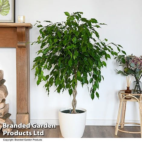 An attractive braided stem supports a canopy of gently weeping branches covered with glossy green foliage making an impressive, upright focal point. Ficus benjamina ‘Exotica’ is particularly good at removing toxins and improving air quality within your home. Height: 300cm (118″). Spread: 150cm (59″).