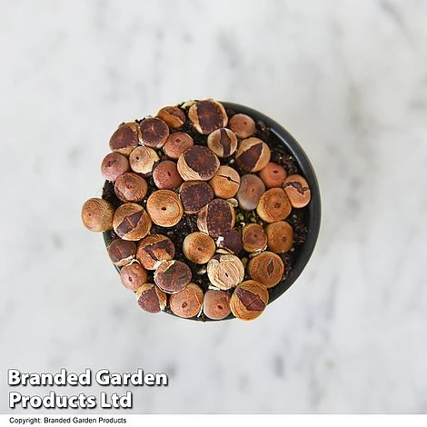 Originating from southern Africa, these curious Lithops feature intricate camouflage patterns that disguise them as pebbles to avoid being grazed by animals. Lithops consist of just one pair of bulbous leaves with a small gap between them from which new leaves and flowers emerge. The stemless leaves store water and the bulk of the leaf structure remains underground, enabling these cunning little plants to survive harsh, arid environments. Their low water requirements make them excellent as houseplants and during summer they may even reward with white or yellow daisy-like flowers. Height: 2.5-10cm (1-4in).