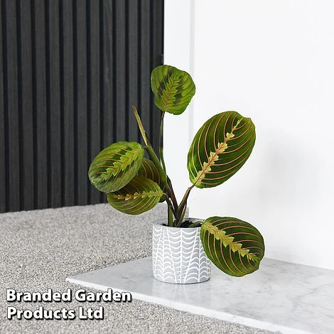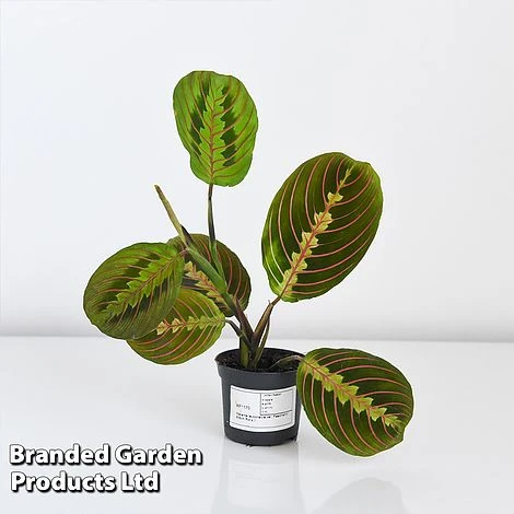 Maranta leuconeura ‘Fascinator’ is a simply stunning house plant boasting amazingly colourful leaves, which are dark green with light green down the centre and striking red veins. The leaves close upwards at night, giving it the name of prayer plant. A showy yet curious plant.