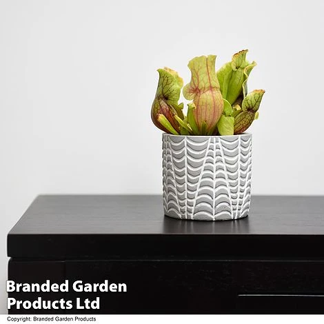 Sarracenia purpurea var. montana is an unusual species that bears short, squat pitchers with greenish lids and red bodies. Unlike most other Sarracenia, the lid doesnโt cover the pitcher but forms ear-like wings that curl inwards and are patterned with beautiful tree-like veining. Sweet secretions on the lip of the pitcher lure unsuspecting insects that slide down the slippery funnel, tumbling to their deaths in a pool of digestive juices at the bottom. Makes an unusual specimen for a greenhouse, conservatory or windowsill and an ideal gift for the botanically curious. Height: 10cm (4in). Spread: 20cm (8in).