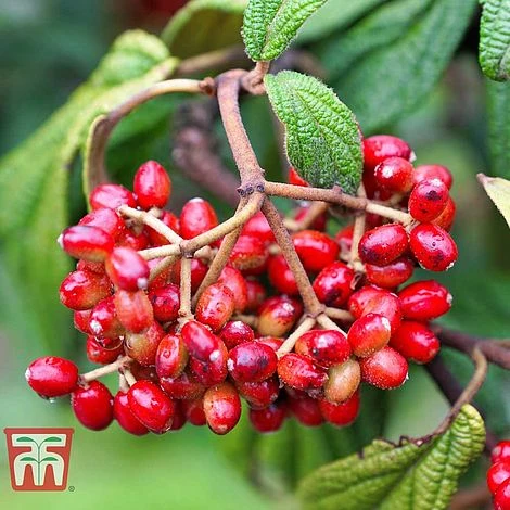 This impressive, hardy Viburnum is one of the larger species which will quickly make an impact in the garden. The dark, evergreen foliage is prominently veined and felted grey beneath – a lovely backdrop for the clusters of white flowers in spring. Female plants may produce small red berries if the flowers are pollinated, which ripen to glossy black. Viburnum rhytidophyllum is a handsome, large shrub which makes a superb screening plant or hedge in larger gardens. When planted in mixed borders and woodland gardens, it will provide valuable year-round structure and colour. Height: 4m (13′). Spread: 5m (16′).