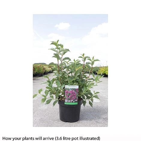 A deciduous shrub, forming clusters of bell-shaped, rose-pink flowers that open in spring, right the way through to early summer. Green foliage with serrate margins provide a wonderful backdrop to the flowers and retain good colour throughout the growing season. Weigela florida ‘Korea’ is dense and rounded in shape, spreading wider than it gets tall, which performs best in full sun. Height: 3m (10′). Spread: 4m (12′).
